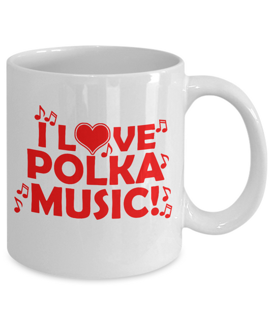 Music Lover Gift Coffee Mug, I Love Polka Music-White Porcelain Coffee Mug 11 oz For Father, Mother, Brother, Sister, drummer, Music Lover, Music Teacher