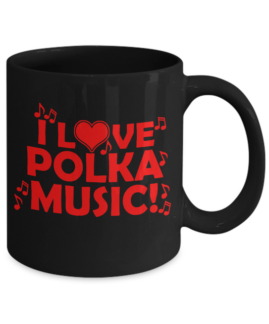 Music Lover Gift Coffee Mug, I Love Polka Music-Black Porcelain Coffee Mug 11 oz For Father, Mother, Brother, Sister, drummer, Music Lover, Music Teacher
