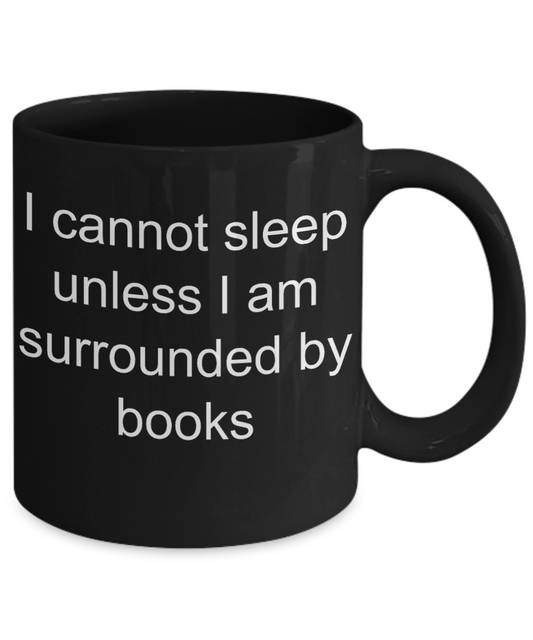 Book Reader Coffee mug, I can't sleep unless i am surrounded by books-Black Coffee Mug 11 oz