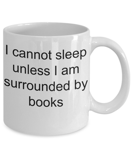 Book Reader Coffee mug, I can't sleep unless i am surrounded by books-White Coffee Mug 11 oz