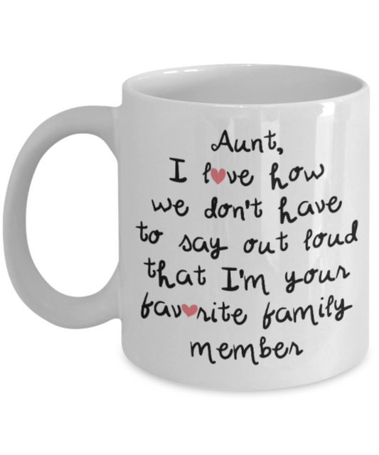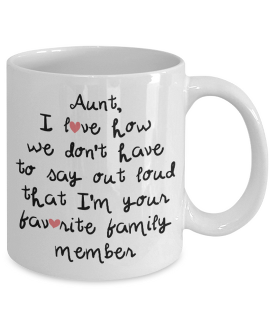 Gifts for an older very sweet aunt - Aunt I love how we don't have to say out loud that I'm your favorite family member - Funny White Porcelain Coffee Mug Cute Ceramic Cup 11 oz