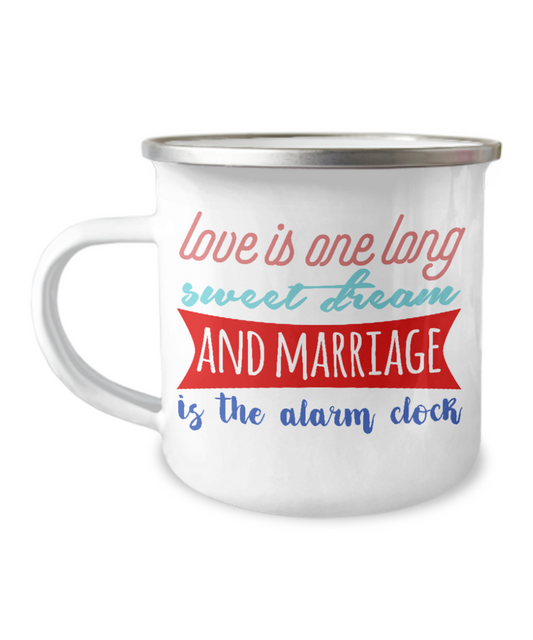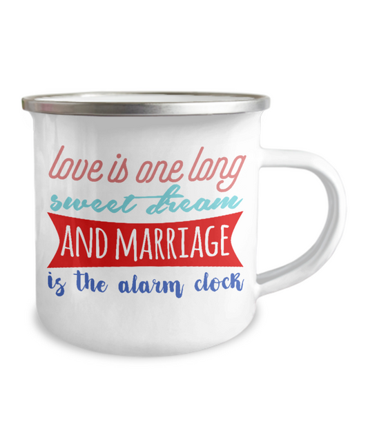 Love Is One Long Sweet Dream And Marriage Is The Alarm Clock -12 Oz Stainless Steel Enamel Finish White Camper Coffee Mug