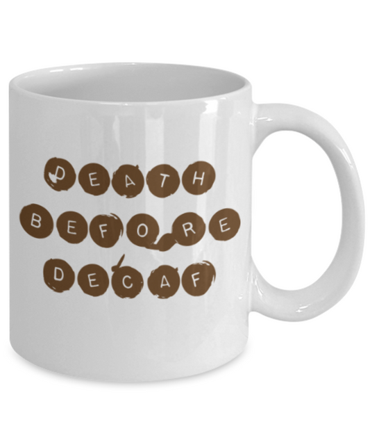 Beer Food Lovers mugs , Death Before Decaf - White Coffee Mug Porcelain Tea Cup 11 oz - Great Gift