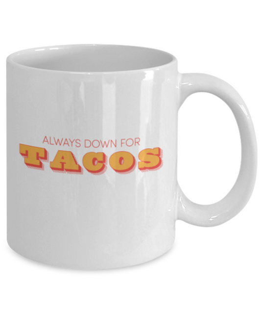 Beer Food Lovers mugs , Always down for Tacos - White Coffee Mug Porcelain Tea Cup 11 oz - Great Gift