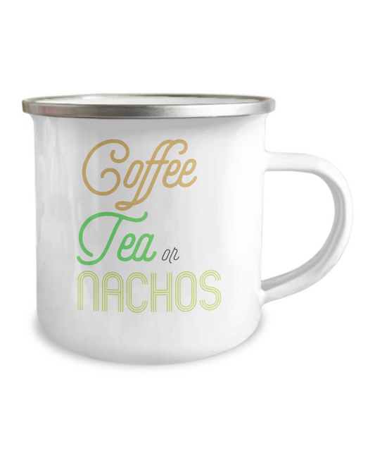 Coffee Tea Or Nachos, Coffee Lover Mug, Tea Lover Mug - 12 Oz Stainless Steel Enamel Finish White Camper Coffee Mug