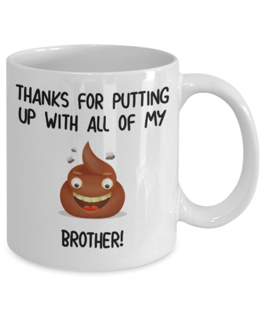 Brother gift mugs, Thanks for putiing up with all my shit Brother - Funny White Porcelain Coffee Mug Cute Ceramic Cup 11 oz