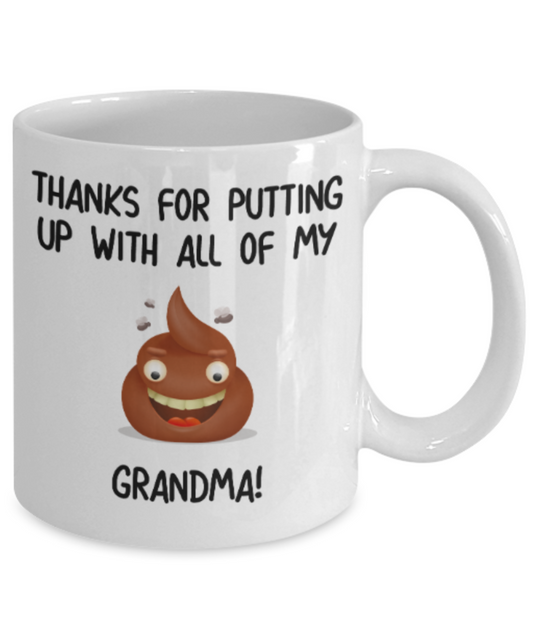 Grandma gift mugs, Thanks for putiing up with all my shit Grandma - Funny White Porcelain Coffee Mug Cute Ceramic Cup 11 oz