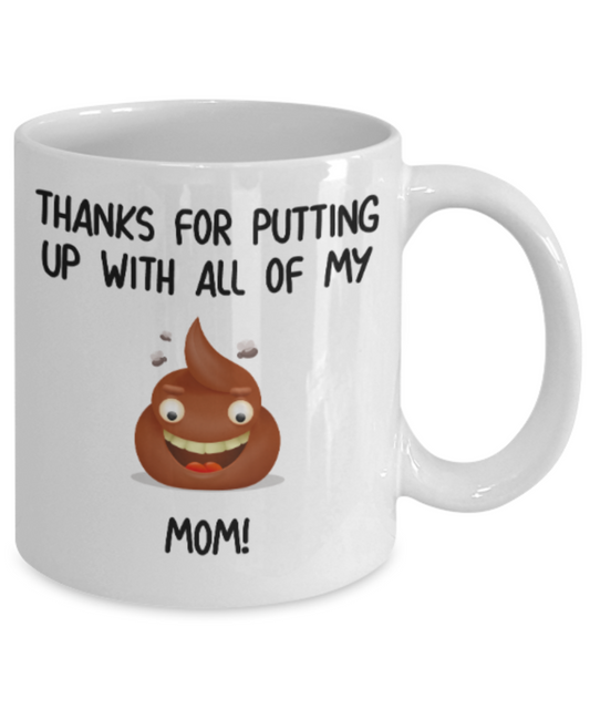 Mom gift mugs, Thanks for putiing up with all my shit Mom - Funny White Porcelain Coffee Mug Cute Ceramic Cup 11 oz