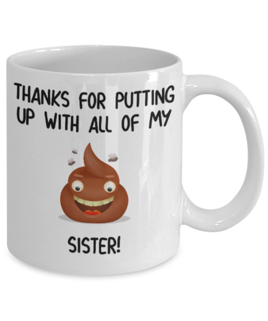 Sister gift mugs, Thanks for putiing up with all my shit Sister - Funny White Porcelain Coffee Mug Cute Ceramic Cup 11 oz