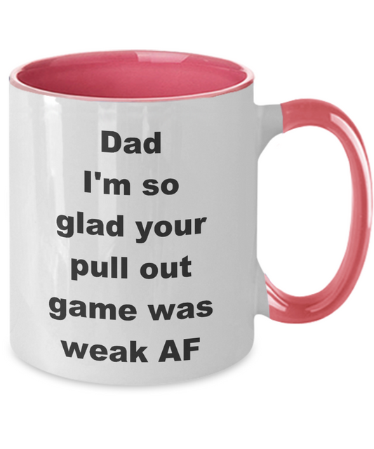 Thanks dad for not pulling out Two Tone coffee mug - Dad I_m so glad your pull out game was weak AF - Funny Mugs Gift Ideas Two Tone 11 Oz