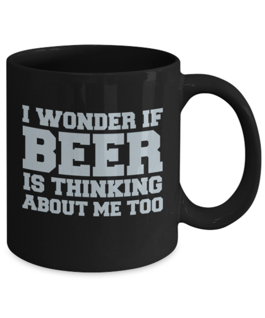 Beer Lovers mugs , I wonder if beer is thinking about me too - Black Coffee Mug Porcelain Tea Cup 11 oz - Great Gift