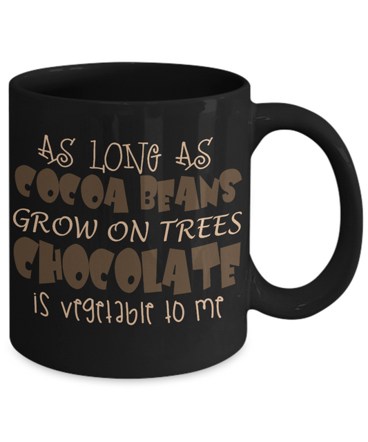 As Long As Cocoa Beans Grow On Trees Chocolate Is Vegetable To Me- Black Porcelain Coffee Mug 11 Oz Funny Quotes Coffee Mug