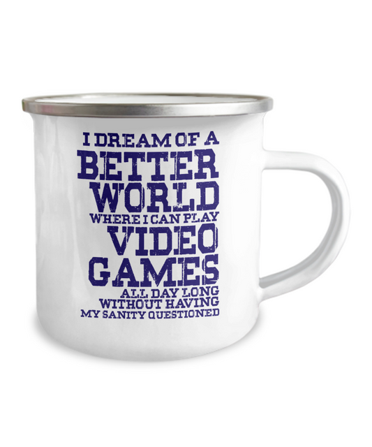 I Dream Of A Better World Where I Can Play Video Games All Day Long -12 Oz Stainless Steel Enamel Finish White Camper Coffee Mug