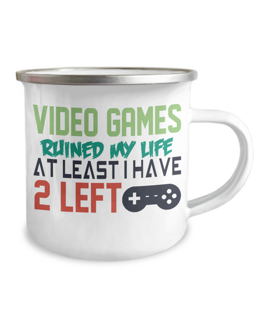 Video Games Ruined My Life At Least I Have 2 Left-12 Oz Stainless Steel Enamel Finish White Camper Coffee Mug