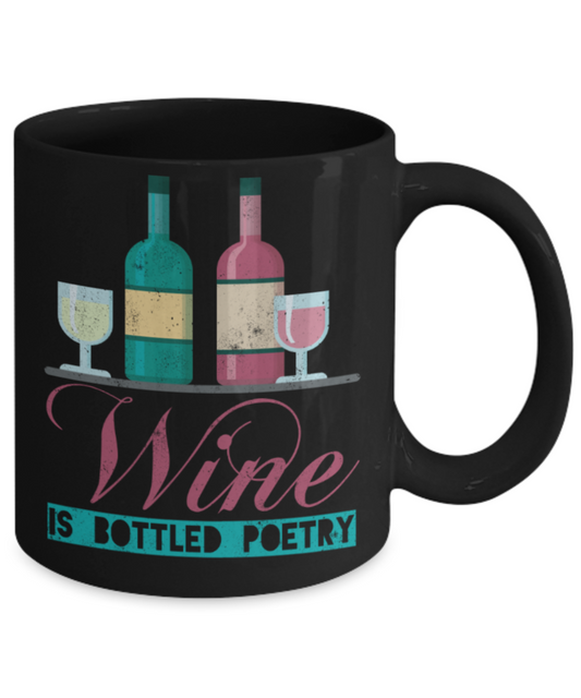 Wine Lovers Mugs, Wine is bottled poetry - Funny Black Porcelain Coffee 11 oz