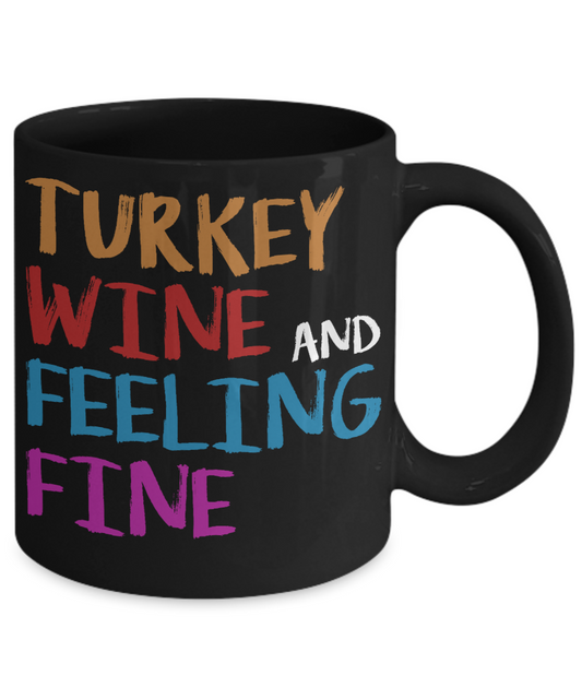 Thanksgiving Coffee Mug, Turkey Wine And Feeling Fine - Black Porcelain Coffee Mug 11 Oz For Thanksgiving Day