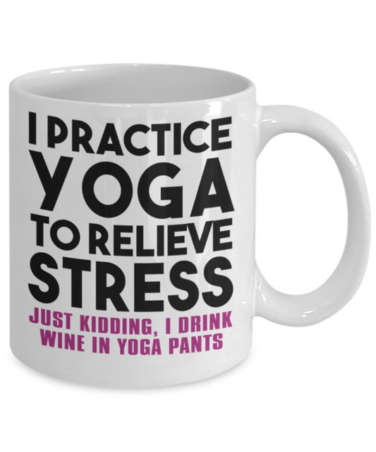 Yoga lovers mugs, I practice yoga to relieve stress, JUst kidding - Funny White Porcelain Coffee 11 oz