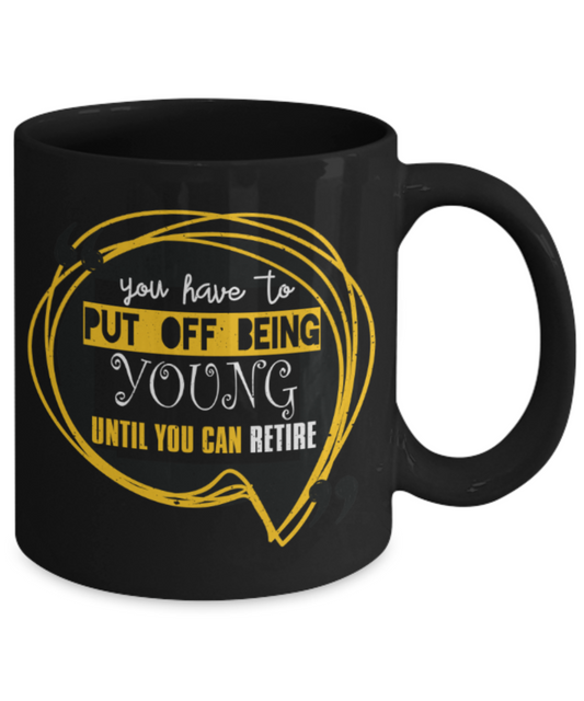 You have to put off being young until you can retire - Funny Black Porcelain Coffee 11 oz