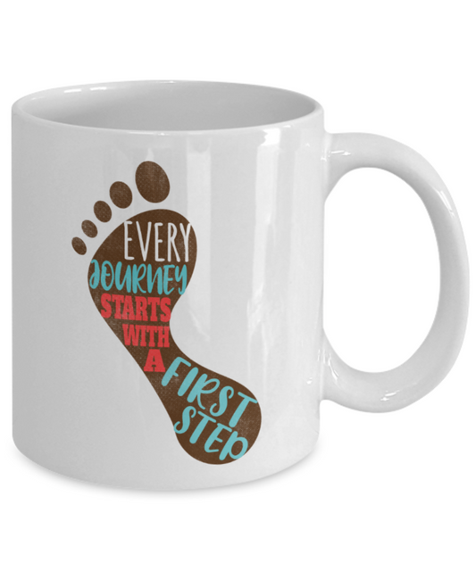 Success Lovers Mugs, Every journey starts with a first step - Funny White Porcelain Coffee 11 oz