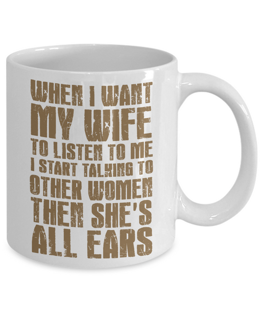 Wifey And Hubby Coffee Mug, When I Wait My Wife To Listen To Me I Started Talking To Other Women She's All Ears-White Porcelain Coffee Mug 11 oz