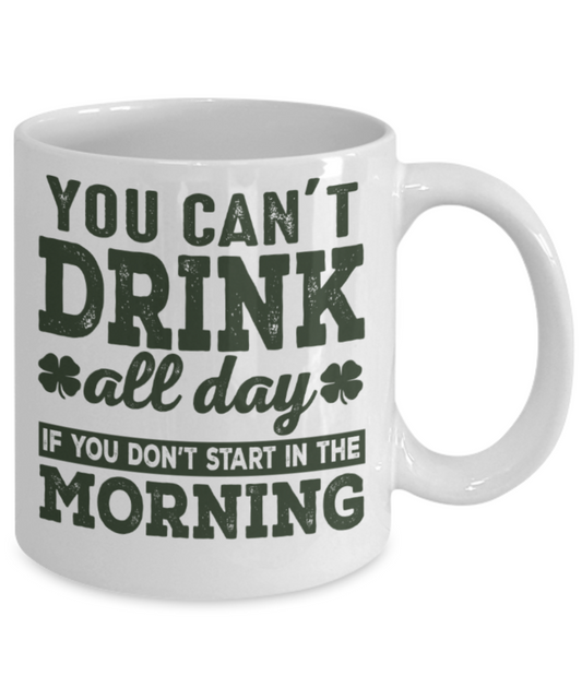 St patrick day assesories coffee mug - You can't drink all day if you don't start in the morning - Funny White Porcelain Coffee Mug Cute Ceramic Cup 11 oz