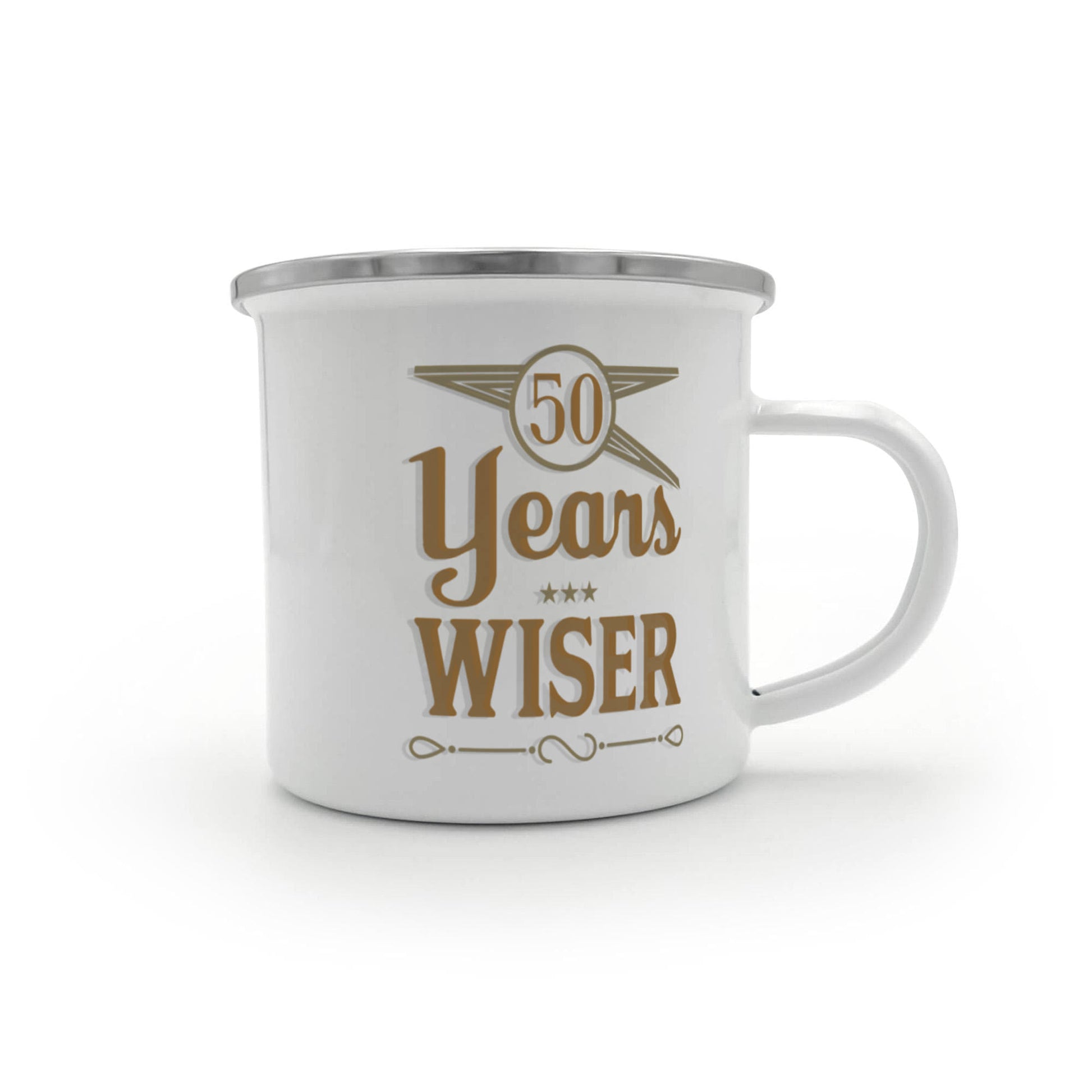 50th Birthday Coffee Mug, for Father, Mother, 50 Years Wiser, Mug For 50th Birthday- 12 oz Stainless Steel Enamel Finish White Camper Coffee Mug
