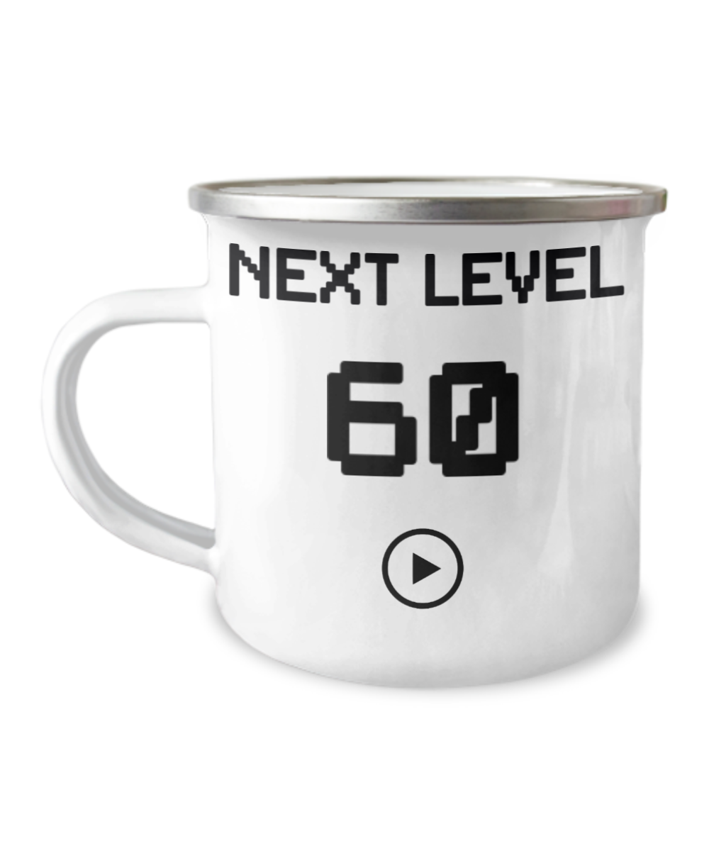 60th Birthday Coffee Mug, Next Level 60, Gamer Coffee Mug, Birthday Mug- 12 Oz Stainless Steel Enamel Finish White Camper Coffee Mug