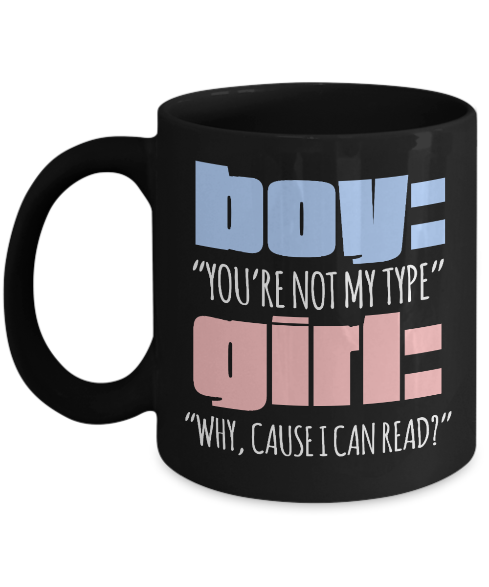 Boy-You're Not My Type Girl- Why, Cause I Can Read- Black Porcelain Coffee Mug 11 Oz Funny Quotes Coffee Mug