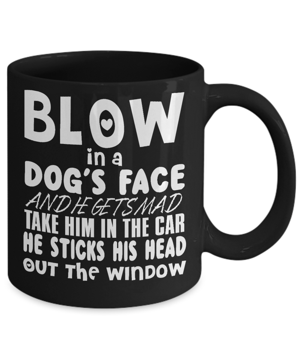 Dog Lover Coffee Mug, Blow In A Dog's Face And He Gets Mad Take Him In The Car He Sticks His Head Out The Window-Black Porcelain Coffee Mug 11 Oz
