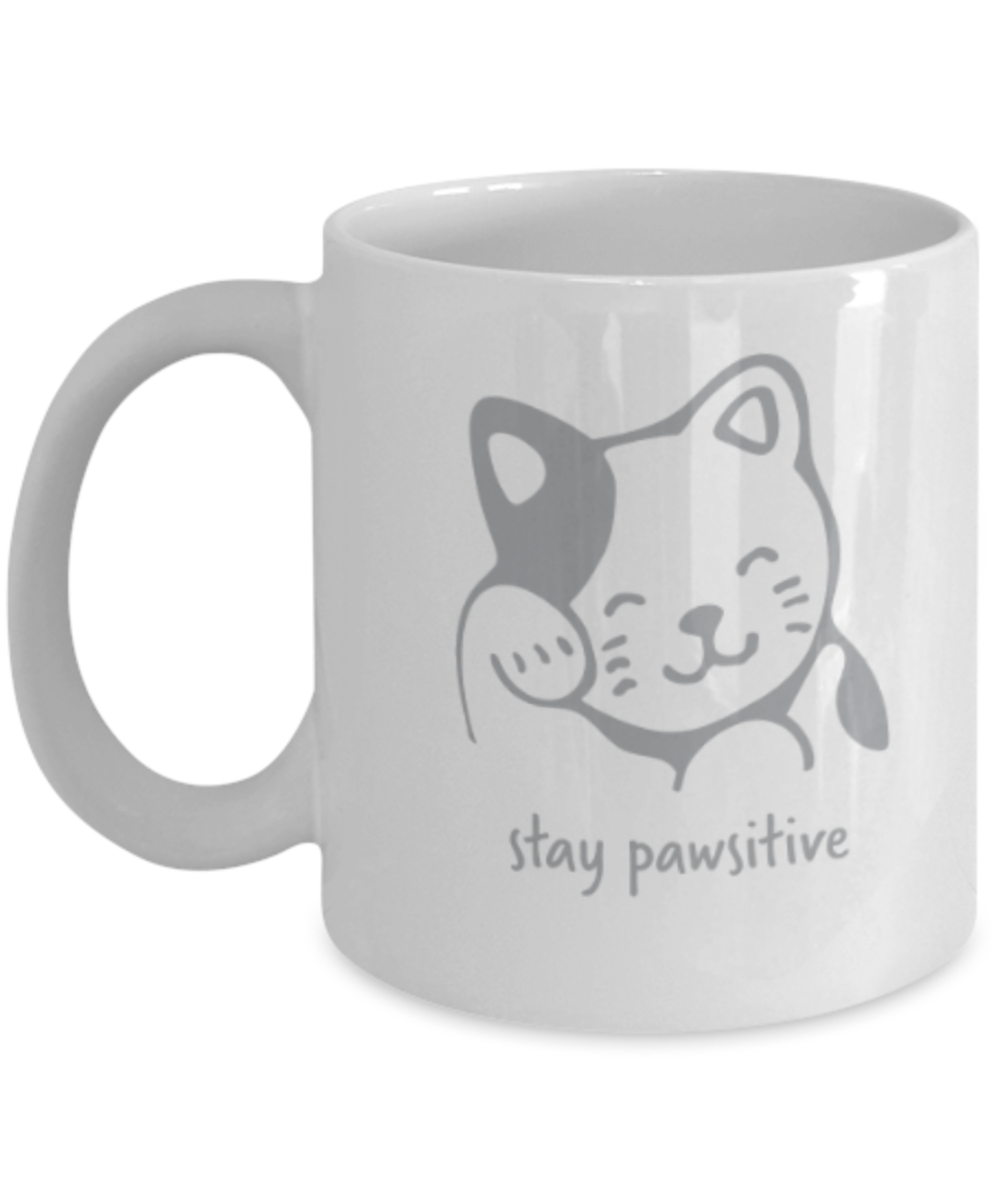Gift gor cat lovers , Stay Pawsitive - White Coffee Mug Porcelain Tea Cup 11 oz - Great Gift