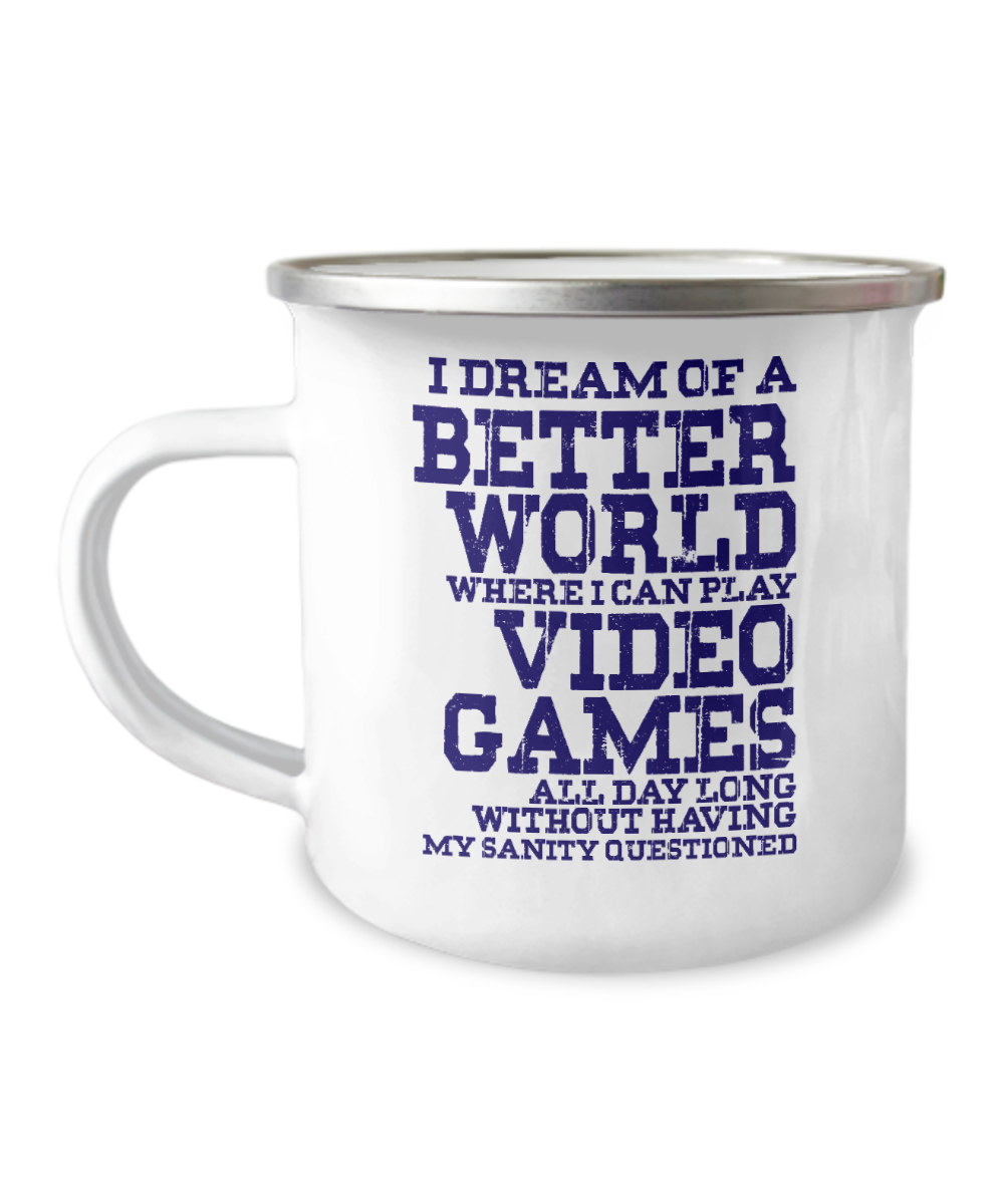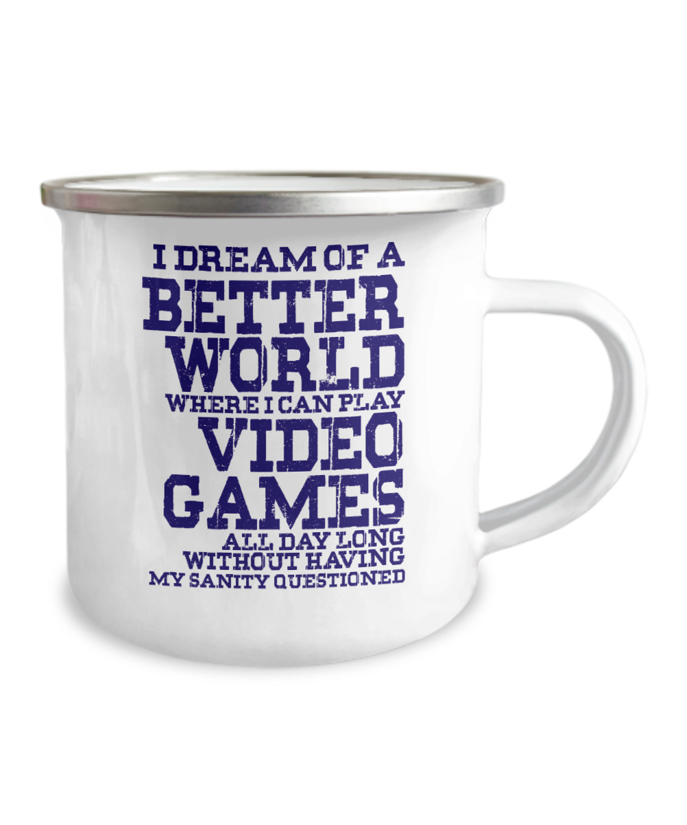 I Dream Of A Better World Where I Can Play Video Games All Day Long - Premium 12 Oz Stainless Steel Enamel Finish White Camper Coffee Mug