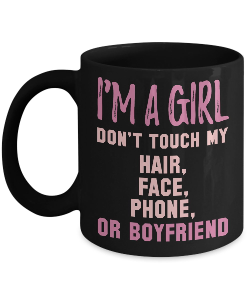 I'm A Girl Don't Touch My Hair, Face, Phone, Or Boyfriend- Black Porcelain Coffee Mug 11 Oz Funny Quotes Coffee Mug