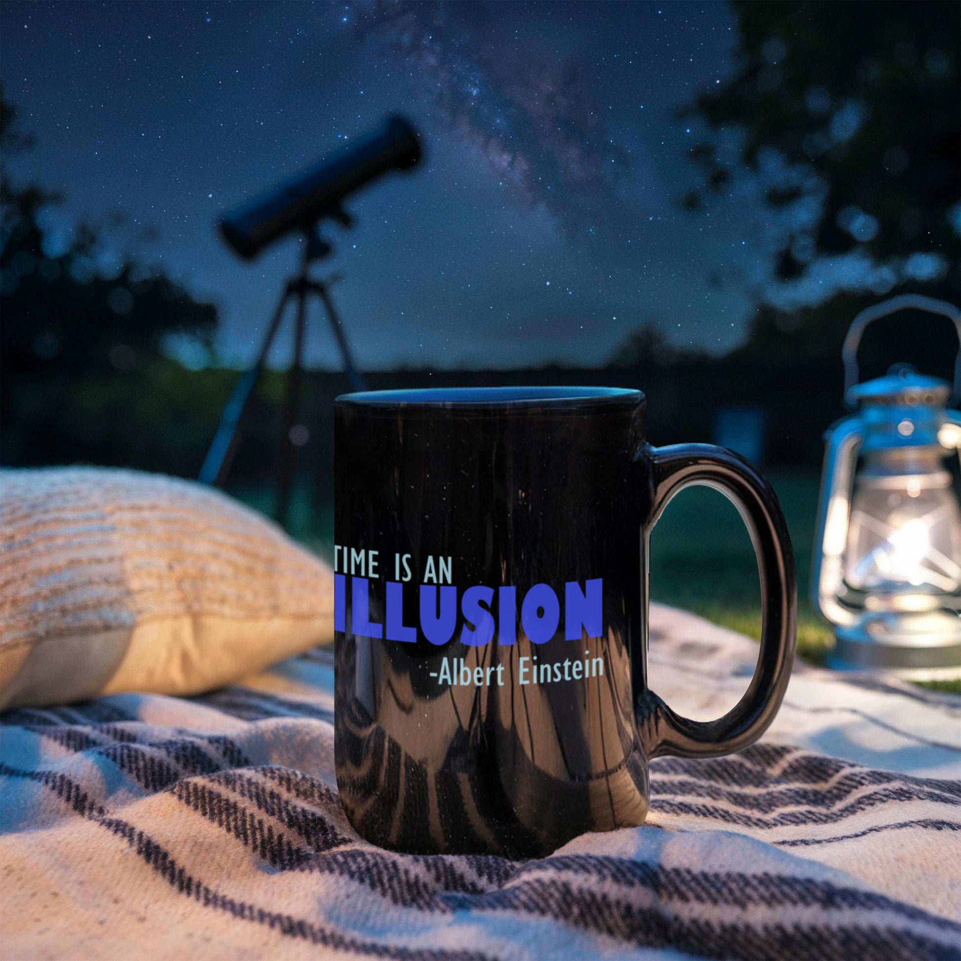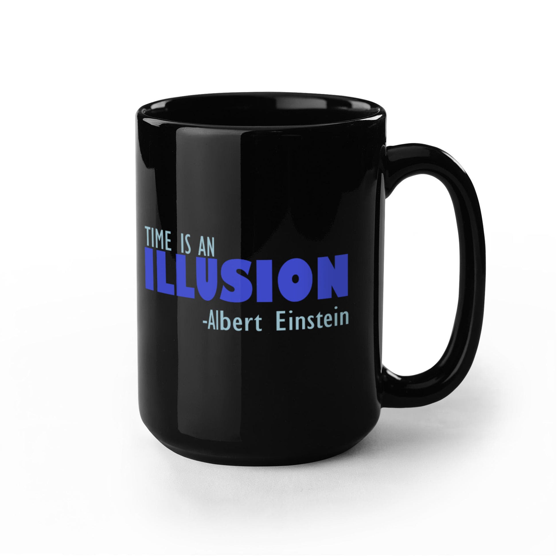 Time Is An Illusion -Albert Einstein- Black Porcelain Coffee Mug 15 oz