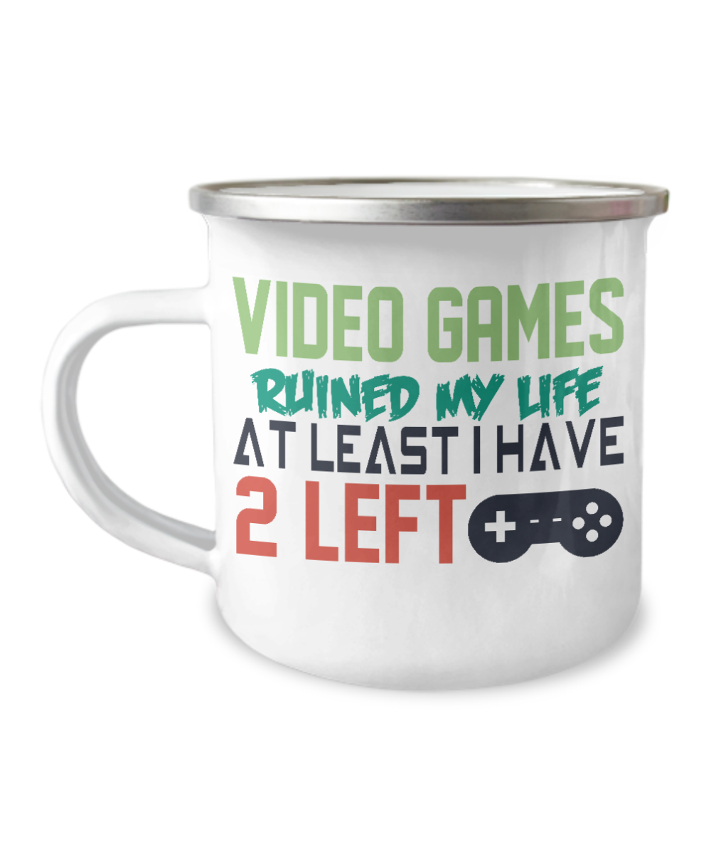 Video Games Ruined My Life At Least I Have 2 Left-12 Oz Stainless Steel Enamel Finish White Camper Coffee Mug