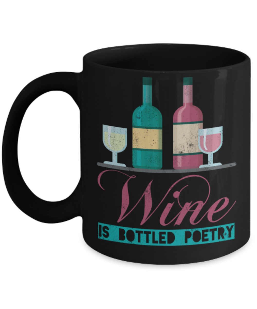 Wine Lovers Mugs, Wine is bottled poetry - Funny Black Porcelain Coffee 11 oz